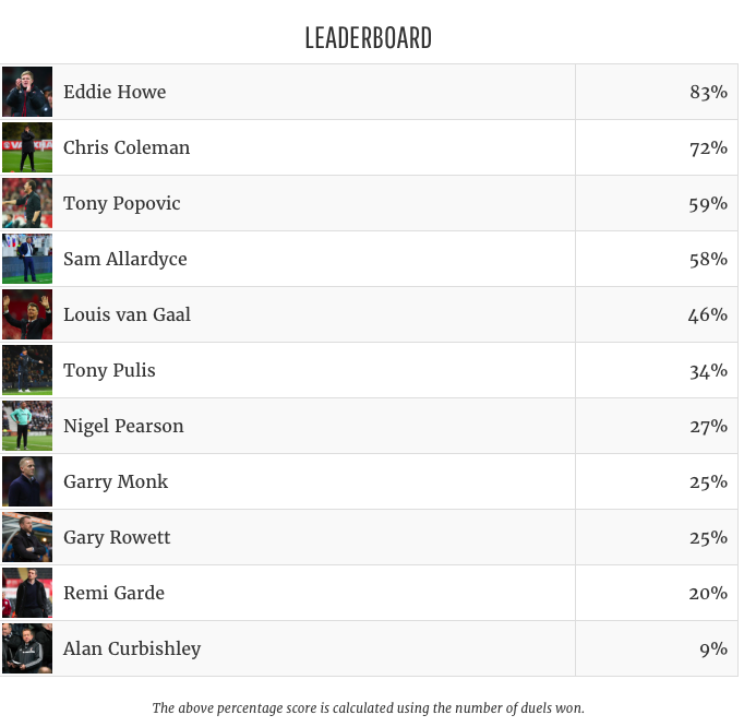 As shown by the table below, Bournemouth manager Eddie Howe was the winner of the duel, with Chris Coleman second and Tony Popovic third.