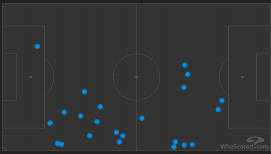 The front two were not at it, either. Zaha clearly struggled in his first game back, and he was marked well by a combination of Chris Basham, John Lundstram and George Baldock on the rare occasions Palace broke into promising positions. Due to the build-up struggles, Benteke was just used as a target man when things became hit and hope. His passes received (below) suggest that the Belgian striker really struggled to get any kind of a foothold, and was made to feed off scraps from the defenders.
